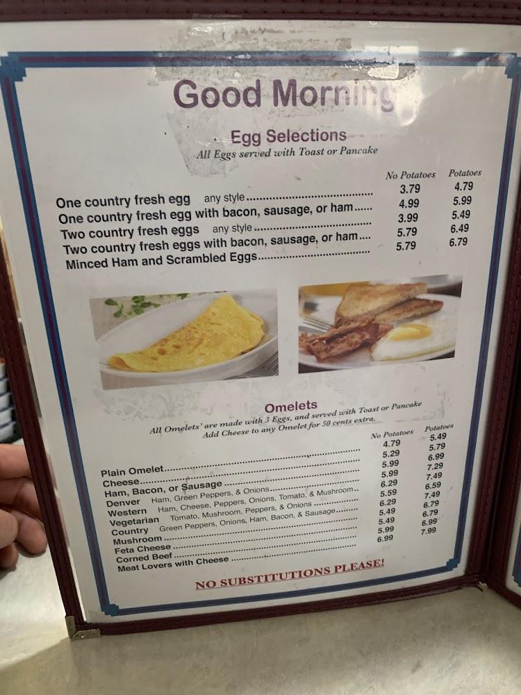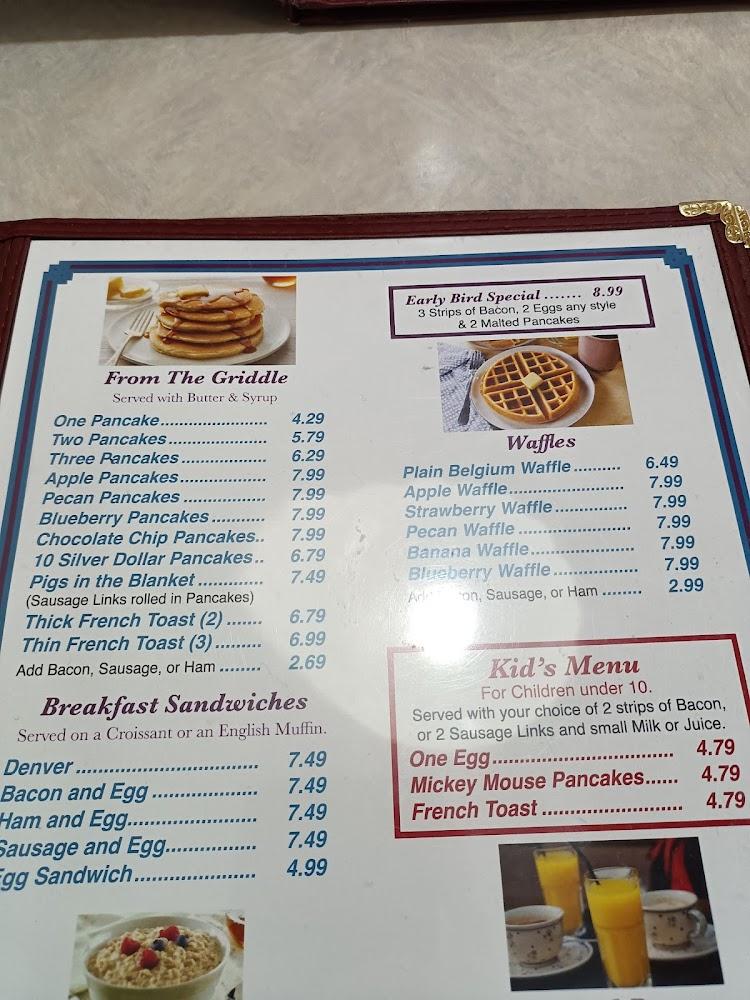 The menu reflects a variety of satisfying options. Breakfast features classics like pancakes, French toast, and hearty skillets. Lunch and dinner offer diverse choices, from savory sandwiches to robust dinner plates. Specials for each day provide additional variety.